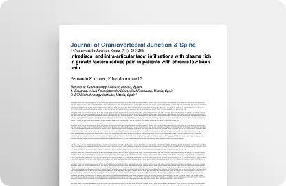 El Dr. Fernando Kirchner, nombrado “Personalidad de Catalunia” es considerado referente mundial en la aplicación de Plasma rico en Plaquetas en columna, es Médico de la Realeza Española, Jefes de Estado y deportistas de élite internacional. Además realiza dichos procedimientos en el Biotecnology Institute (BTI) Fundado por el Dr. Eduardo Anitua, reconocido Centro mundial de Medicina Regenerativa. El Dr. Kirchner es autor de algunas de las primeras publicaciones científicas acerca de la aplicación de Plasma rico en factores de crecimiento para patología de columna, los cuales son considerados de los más relevantes por la comunidad científica y marcan el camino de tan notable y eficiente tratamiento, reflejo de su experiencia de más de 20 años en la materia.